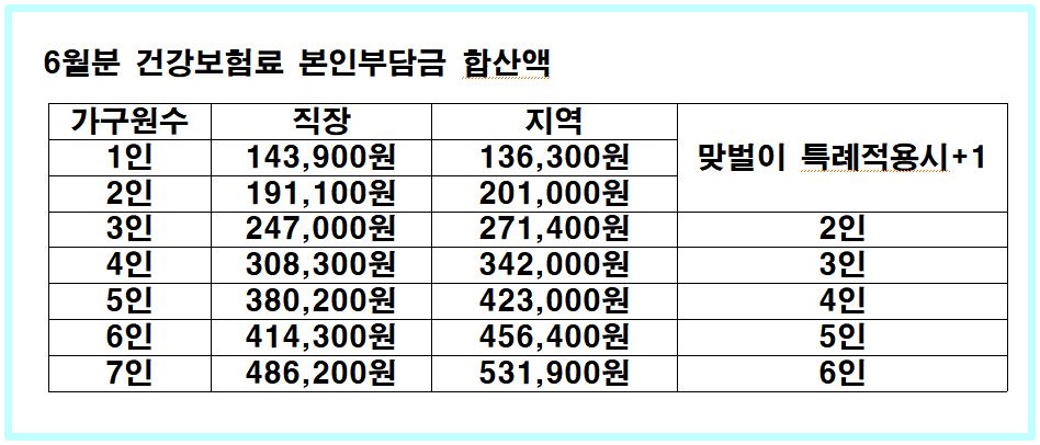 이번에 정부에서 지급하게 되는 코로나 상생지원금의 건강보험료 기준은 6월 기준으로 삼았습니다. 6월을 기준으로 가구별로 합산한 금액을 기준삼아 코로나 5차 재난지원금 대상을 선정할 예정입니다. 외벌이 가구와 가구의 형평성 문제로 특례기준이 적용됩니다. 맞벌이 가구의 경우 가구원수를 +1명을 추가해서 적용합니다.